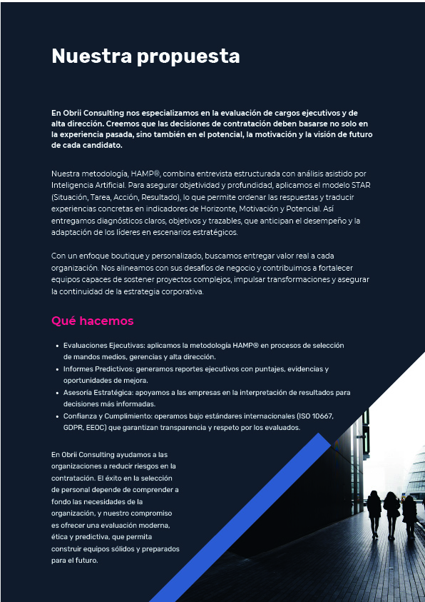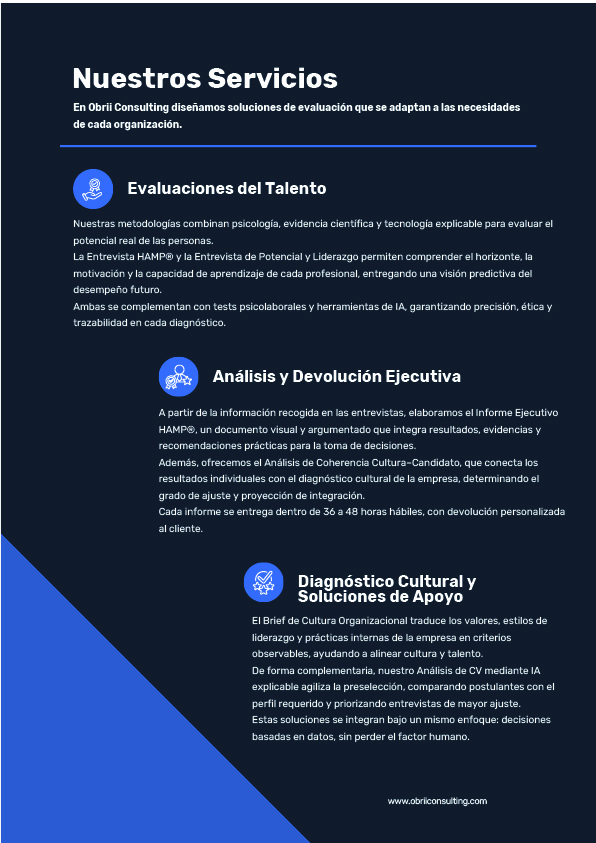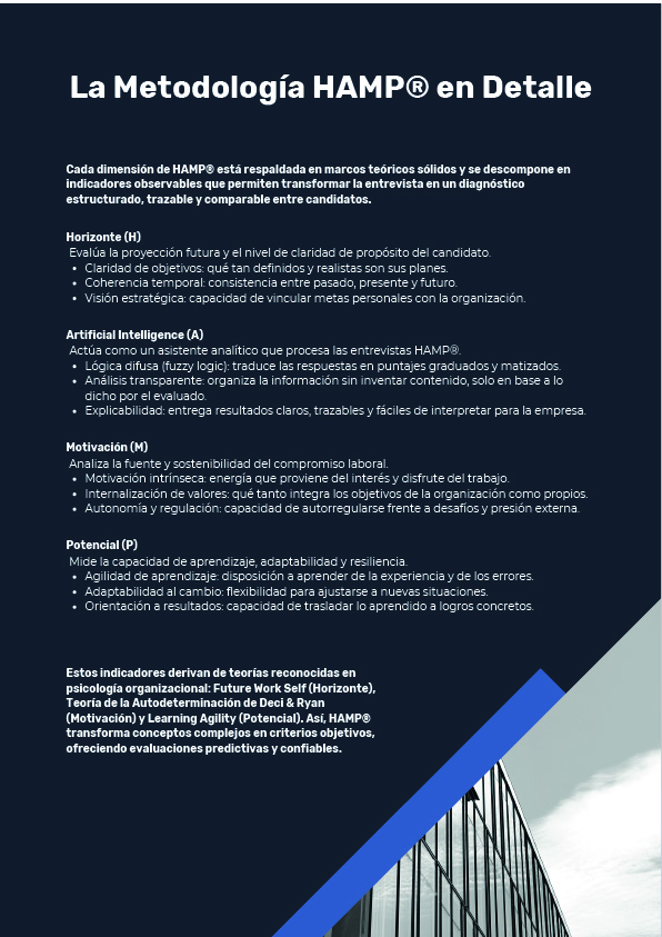 • Entrevista HAMP® (Horizonte–Motivación–Potencial): Evaluación avanzada para roles críticos, con codificación asistida por IA y análisis estructurado.